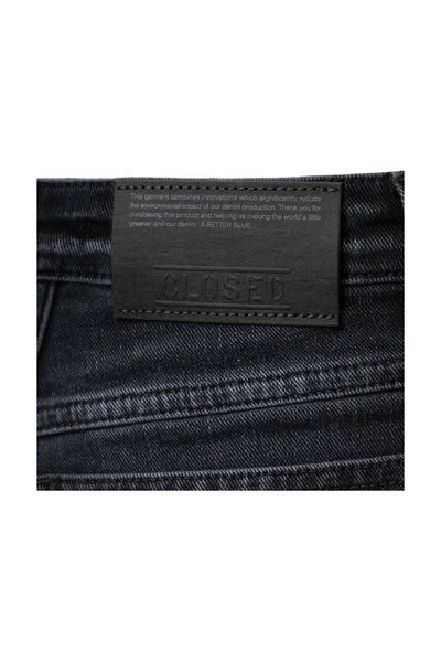 Closed jeans zwarte jeans organische denim grijze knop en zip sluitingsgordel lussen vijf zakken wijd uitlopende bodem magere pasvorm