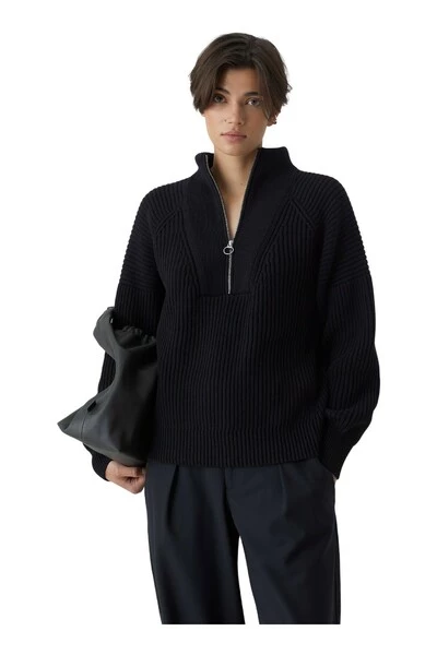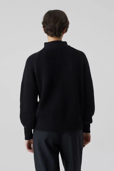 Relaxte pasvorm van puur biologisch katoen: Troyer met opstaande kraag en logorits. Gebreid in een vissersrib met militair geïnspireerde details op de schouders en geribde manchetten. Middelzwaar breisel (5 gg).