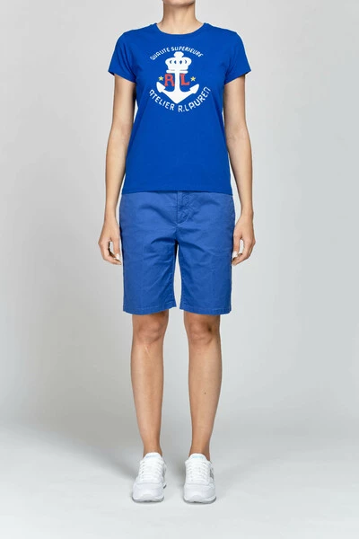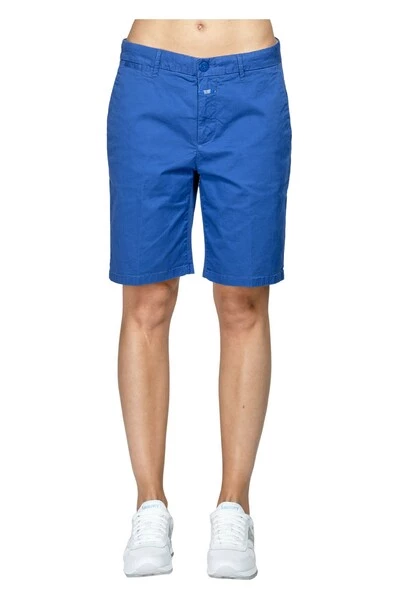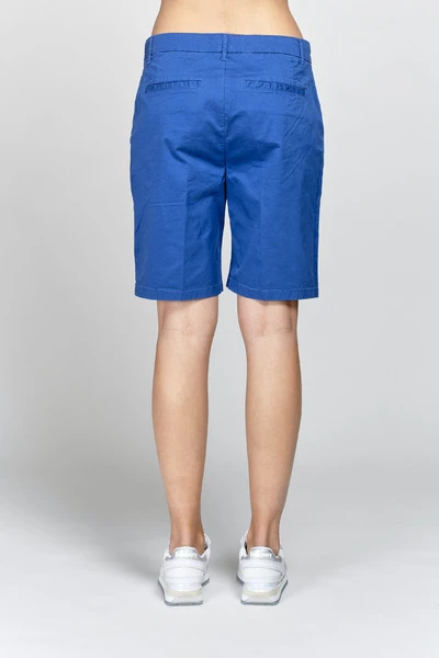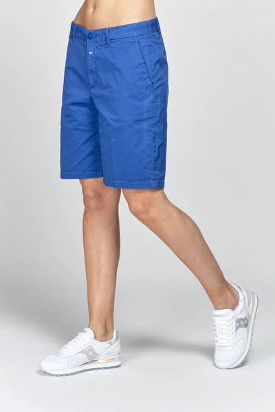 Gesloten korte broek blauwe stretch katoen Bermuda shorts. Normale taille. Comfortabele pasvorm. Lengte boven de knie. Twee zakken aan de voorkant. Twee weldzakken aan de achterkant. Samenstelling: 97% katoen, 3% elastaan
