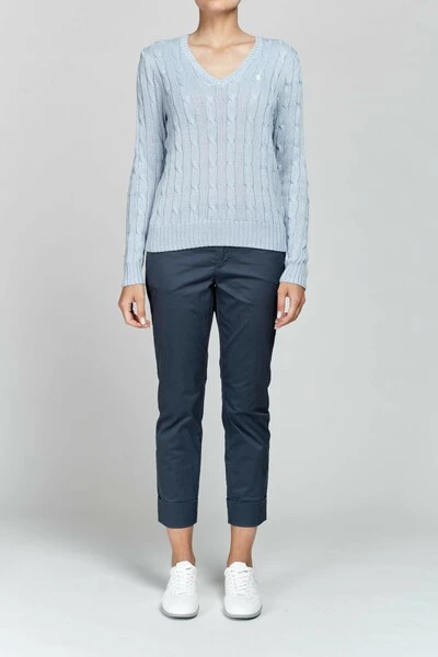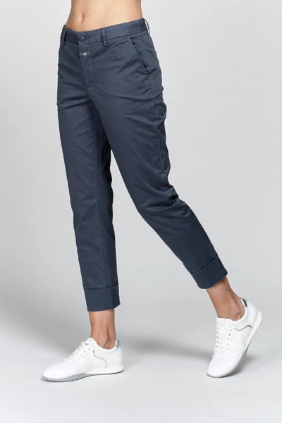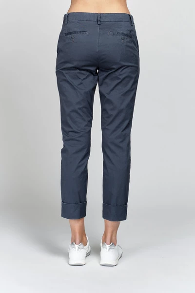 Gesloten broek blauwe chinosbroek. Katoen strekken. Normale taille. Enkel lengte. Hoge manchet onderaan. Zijzakken. Weltzakken aan de achterkant. Samenstelling: 97% katoen, 3% elastaan