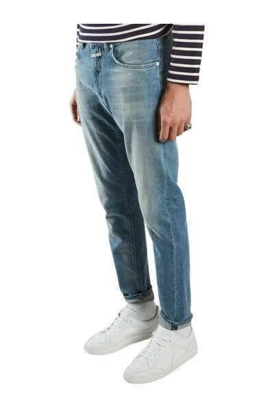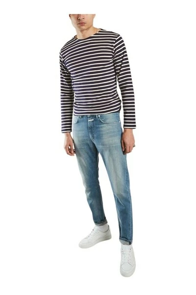 Jeans gemaakt van biologisch katoen, blauwe kleur, wortel gesneden, mid-rise taille, rechte been, dichtgeknoopte vlieg, riemlussen, vijf klassieke zakken, veganistische patch in Jacron achter. Closed biedt ons hier een essentieel van de mannelijke garderobe: de rechte jeans in een comfortabele en natuurlijke versie door de compositie in organische vezels. We dragen deze jeans met een shirt en een paar derbies voor een geklede look of met een hoodie en een paar sneakers.