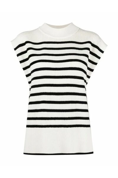 Gesloten truien witte gestreepte mouwloze trui van gesloten met ivoorwit, zwart, wollen casjmere blend, geribbelde gebreide, horizontaal streeppatroon, hoge nek en mouwloos. Positief bewust: wij Ve werkten samen met Good on You – een ethisch bureau dat hoe duurzaam merken beoordeelt in verschillende criteria voor mensen, planeet en dierenwelzijn. Dit product komt van een bewust merk dat goed presteert in relatie tot hun impact op de planeet, zorgt bijvoorbeeld voor het gebruik van materialen die de hoeveelheid chemicaliën, water en afvalwater die betrokken is bij productieprocessen beperken.